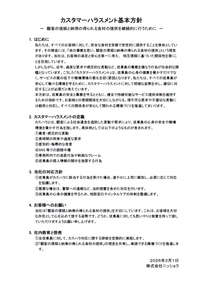 私たち株式会社ニッショクでは、このたび「カスタマーハラスメント基本方針」を策定し、すべての従業員が安全・安心に働けるよう、環境を整えました。会社として、従業員に対する理不尽な要求や言動に対しては組織全体で毅然とした態度で臨み、守る姿勢を明確にします。